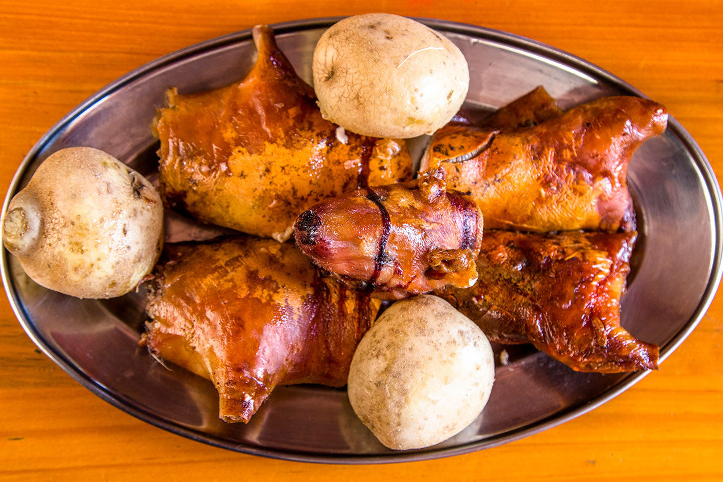 Entradas y platos fuertes se encuentra el cuy principalmente asado a la brasa el frito es una especie de fricasé de carne Generalmente de cerdo el cual se acompaña con Mote maíz tostado papás o arracacha el hornado es cerdo preparado al horno tamal con masa dulce la sopa de poleada el loco.
